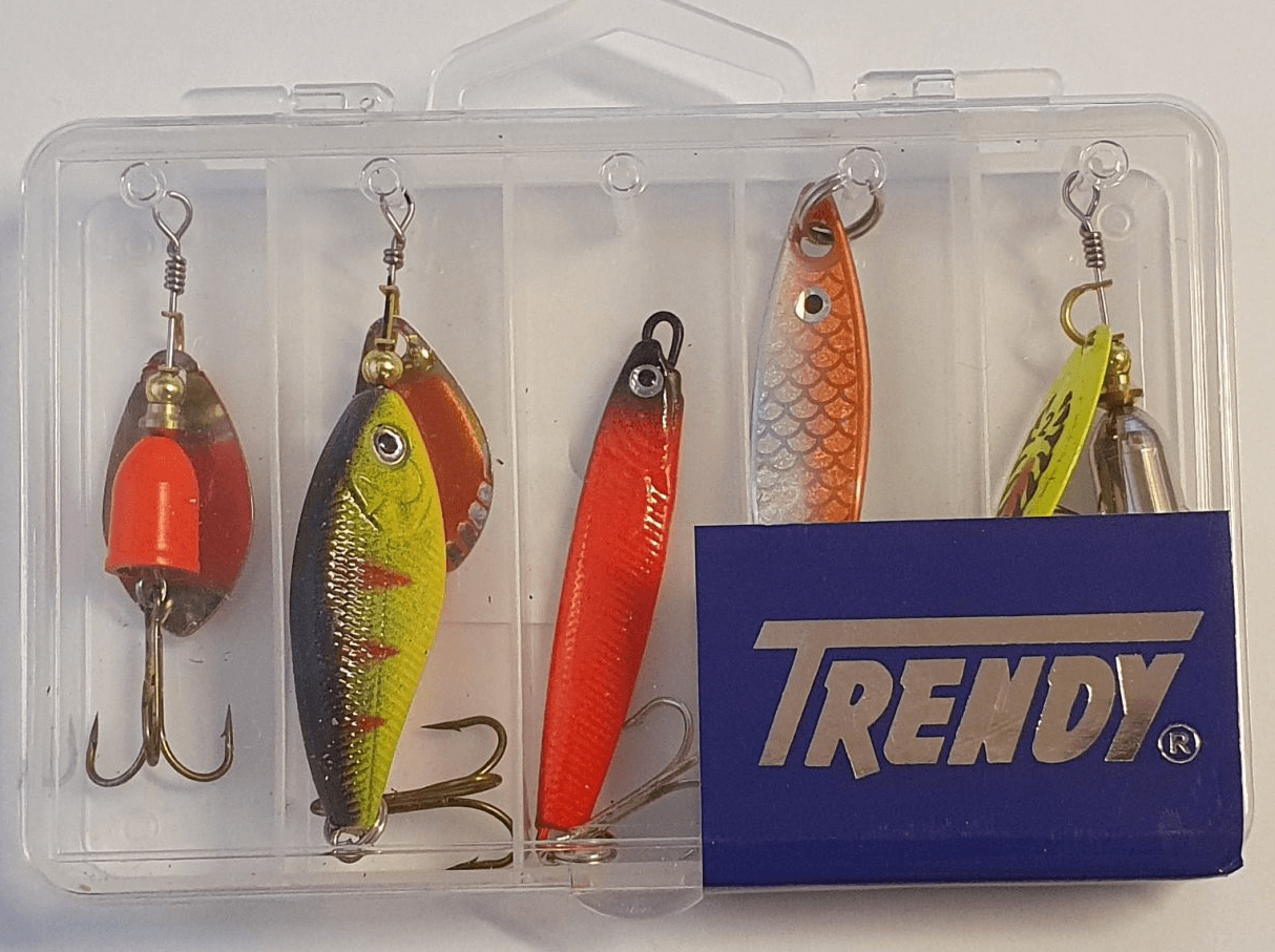 Trendy spinnefiskeri sortiment 120 æske med 3 spinnere samt 2 blink. Æske til opbevaring medfølger.